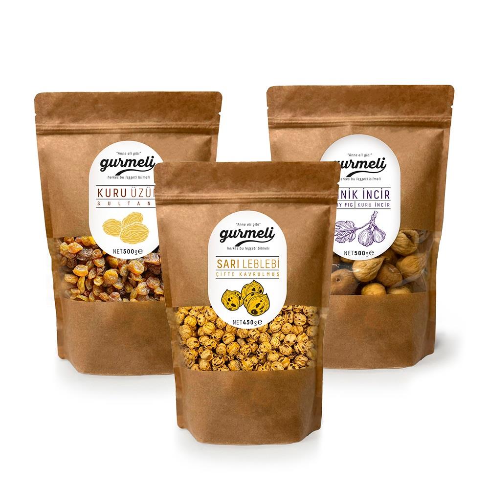 Gurmeli 3'lü Geleneksel Lezzet Paketi: Sultaniye Kuru Üzüm, Çifte Kavrulmuş Sarı Leblebi, Kuru İncir (Doğal Ara Öğün Seti)