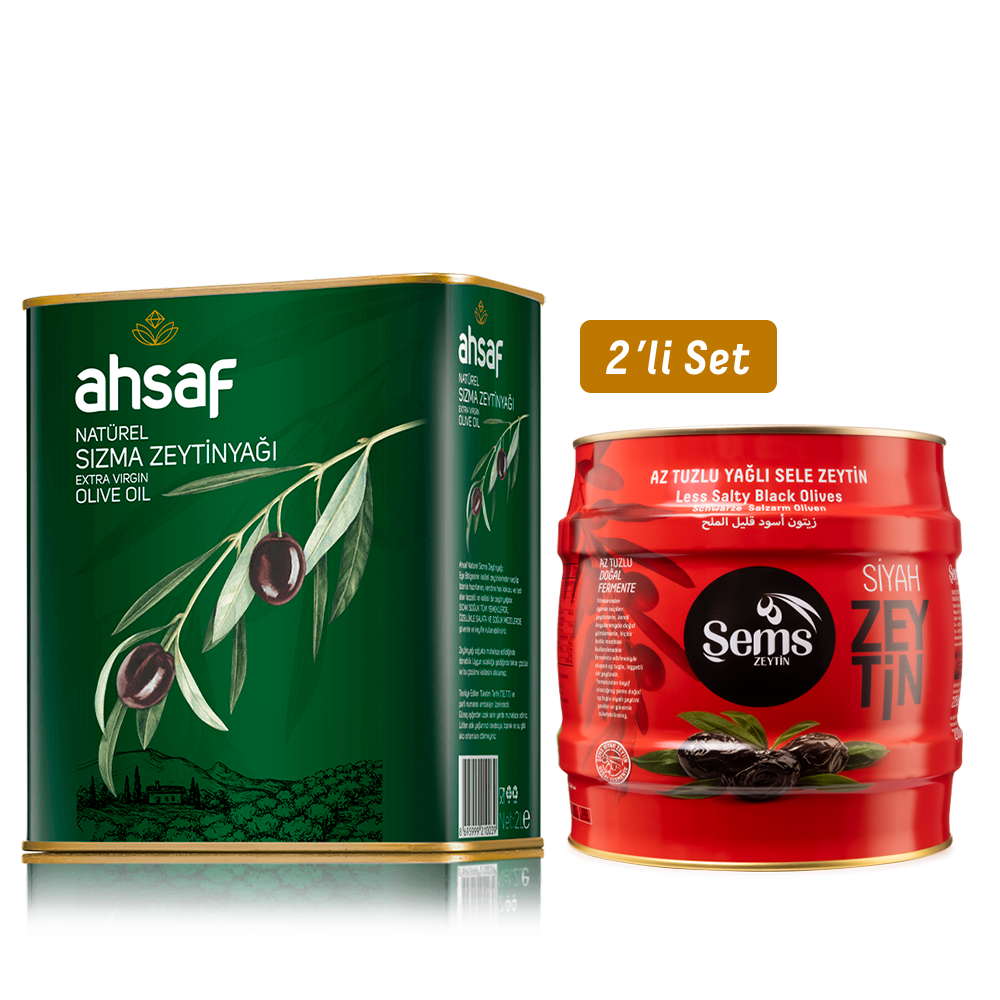 Natürel Sızma Zeytinyağı 2L Teneke + Yağlı Siyah Sele Zeytin 2 Kg 291-320 Kalibre (2'li Ekonomik Paket)
